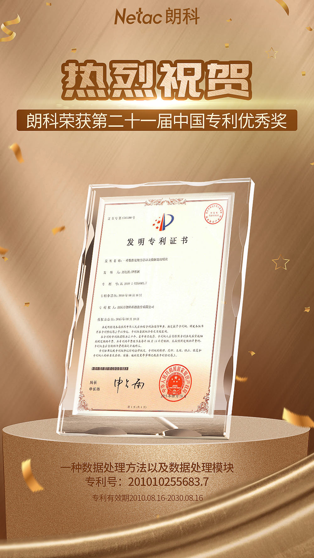 繼朗科閃存盤基礎發明專利(專利號:99117225.6)于2013年榮獲第十五屆中國知識產權最高獎項——中國專利金獎后,2019年10月12日,朗科公司的《一種數據處理方法以及數據處理模塊》(專利號:201010255683.7)再次榮獲第二十一屆中國專利優秀獎,有效期至2030年8月16日。